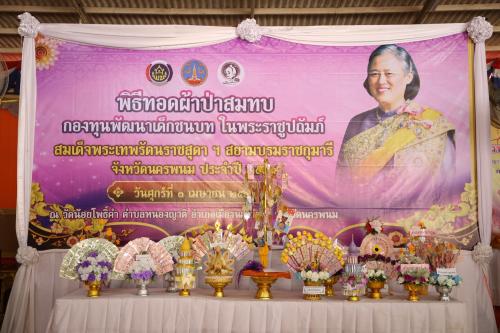 ภายในพิธี ผู้ว่าราชการจังหวัดนครพนมได้นำกล่าวถวายผ้าป่าสมทบกองทุน พร้อมมอบทุนอุปการะกองทุนพัฒนาเด็กชนบทส่วนกลาง ประจำปี 2569 จำนวน 11 ทุน ทุนละ 1,500 บาท รวมเป็นเงินทั้งสิ้น 16,500 บาท เพื่อส่งเสริมและสนับสนุนการพัฒนาเด็กด้อยโอกาสให้มีคุณภาพชีวิตที่ดี